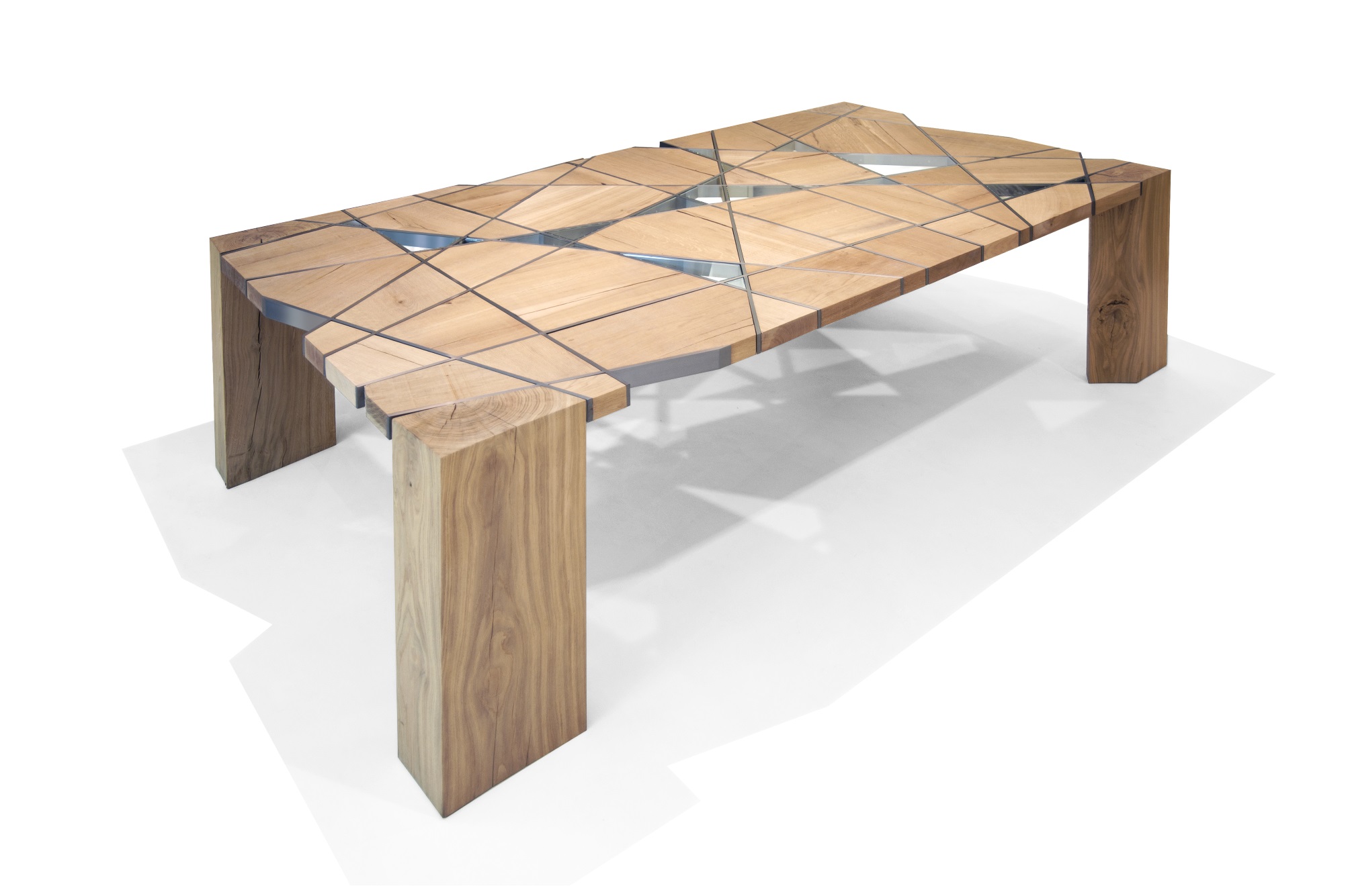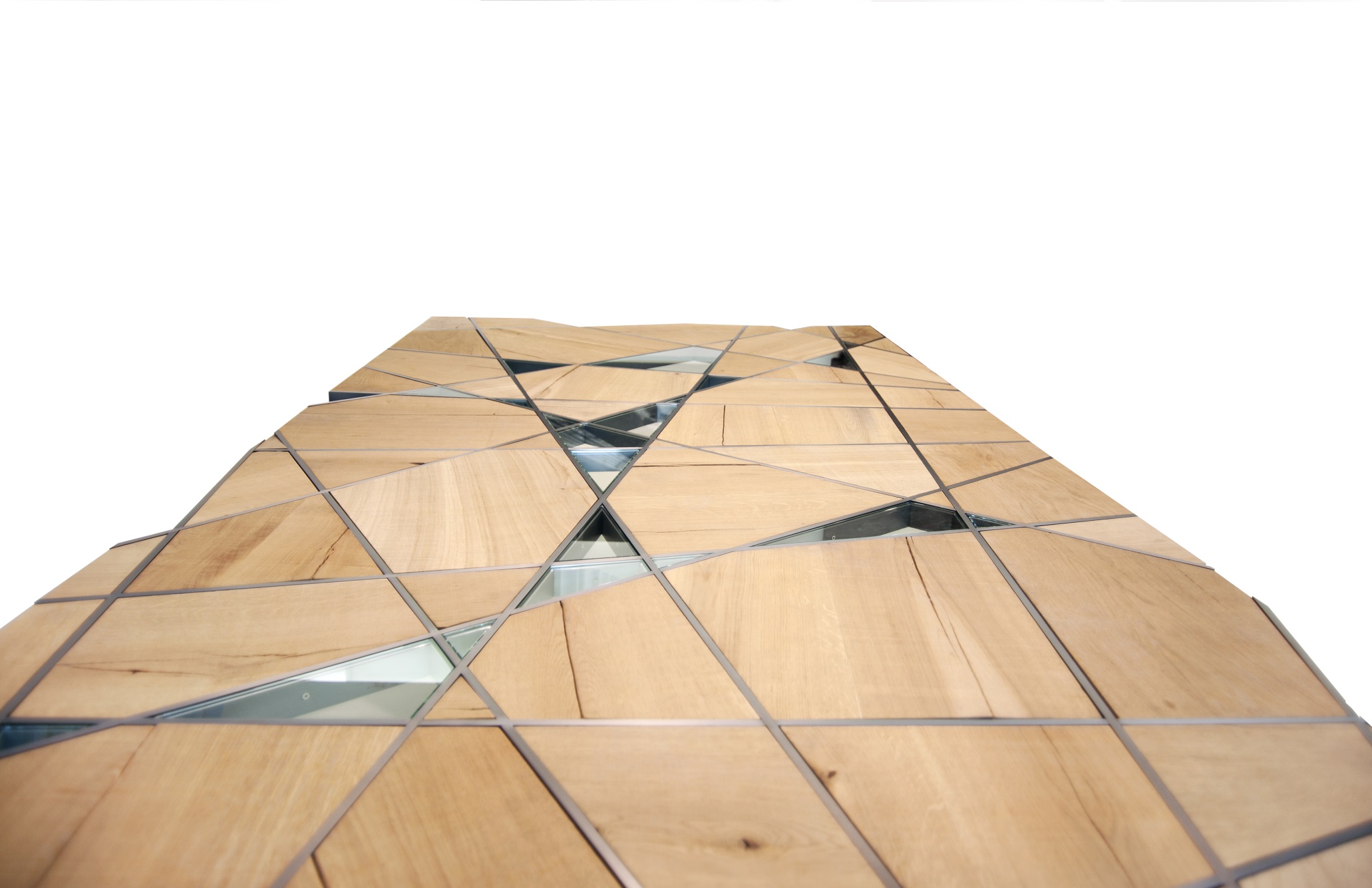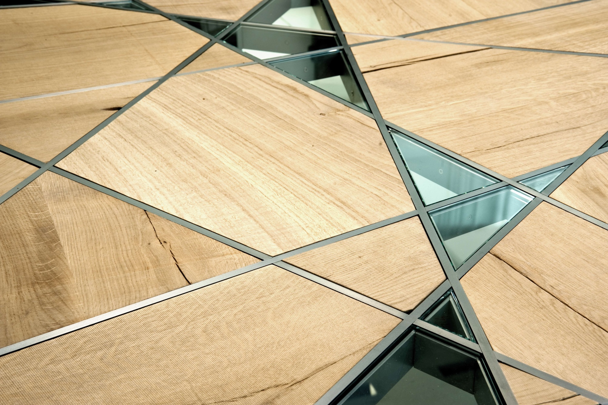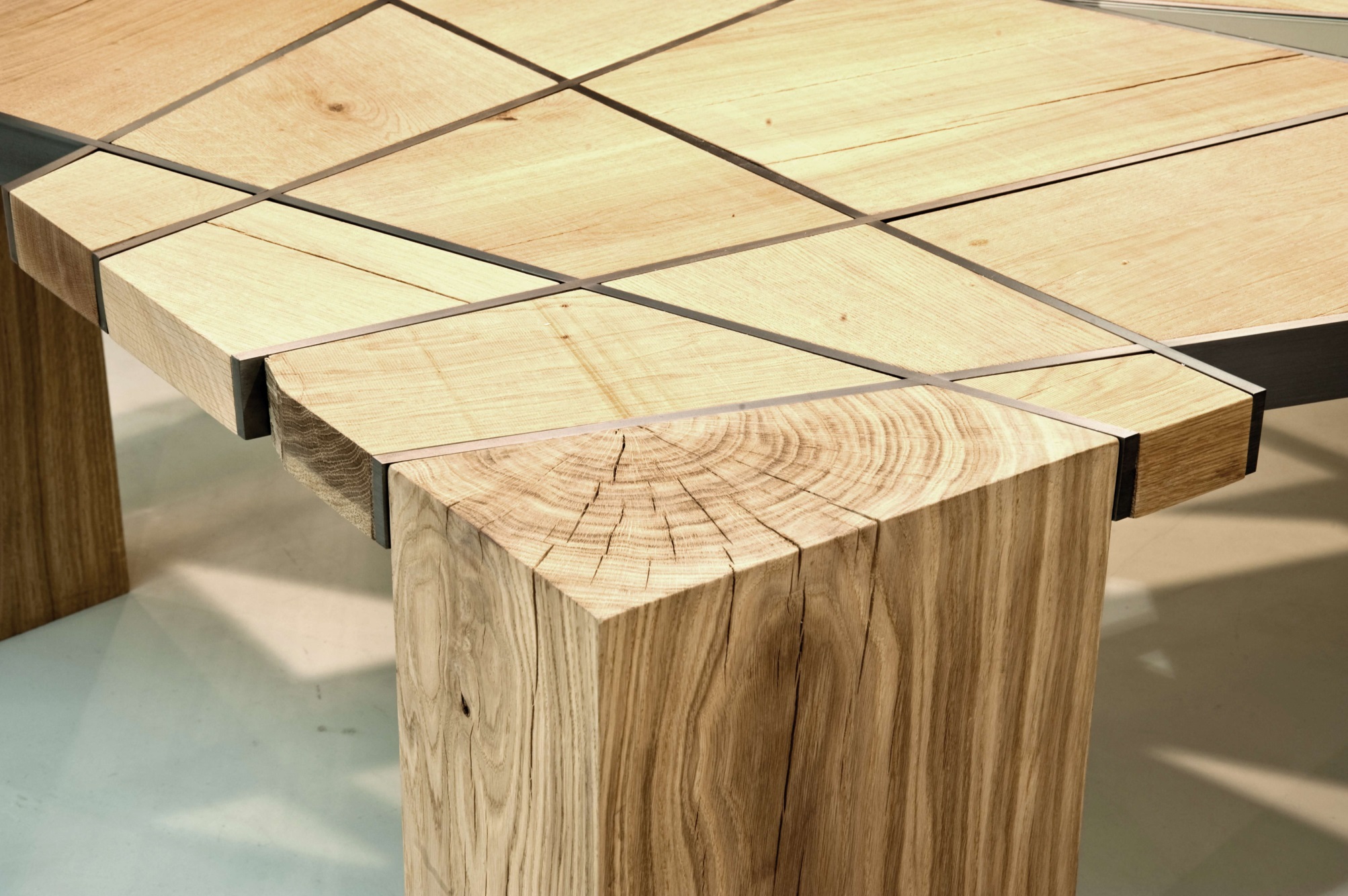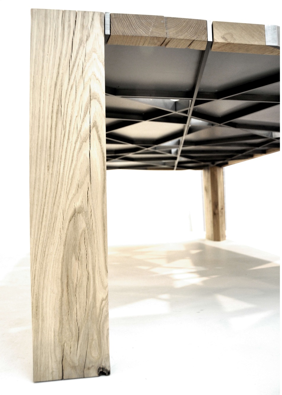 brushed iron/rough oak wood/glass 280x150x75 cm